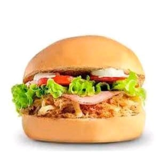 Um lanche refrescante com pão, carne de hambúrguer suculenta, muçarela derretida, presunto suculento, batata palha cr... Ver completo