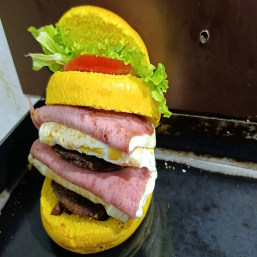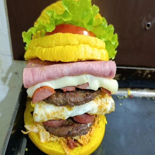 Um lanche especial com pão, carne de hambúrguer suculenta, bacon crocante, muçarela derretida, ovo, presunto suculent... Ver completo
