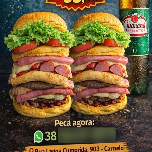 Dois lanches compostos por: Pão, Bacon, 2 Carnes De Hamburguer, 2 Ovos, 02 Muçarelas, 02 Presuntos, Salsicha, Frango D... Ver completo