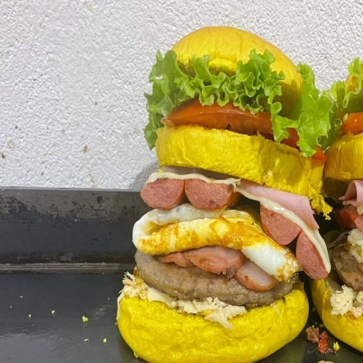 Um lanche completo com pão, carne de hambúrguer suculenta, bacon crocante, frango desfiado, muçarela derretida, ovo, ... Ver completo